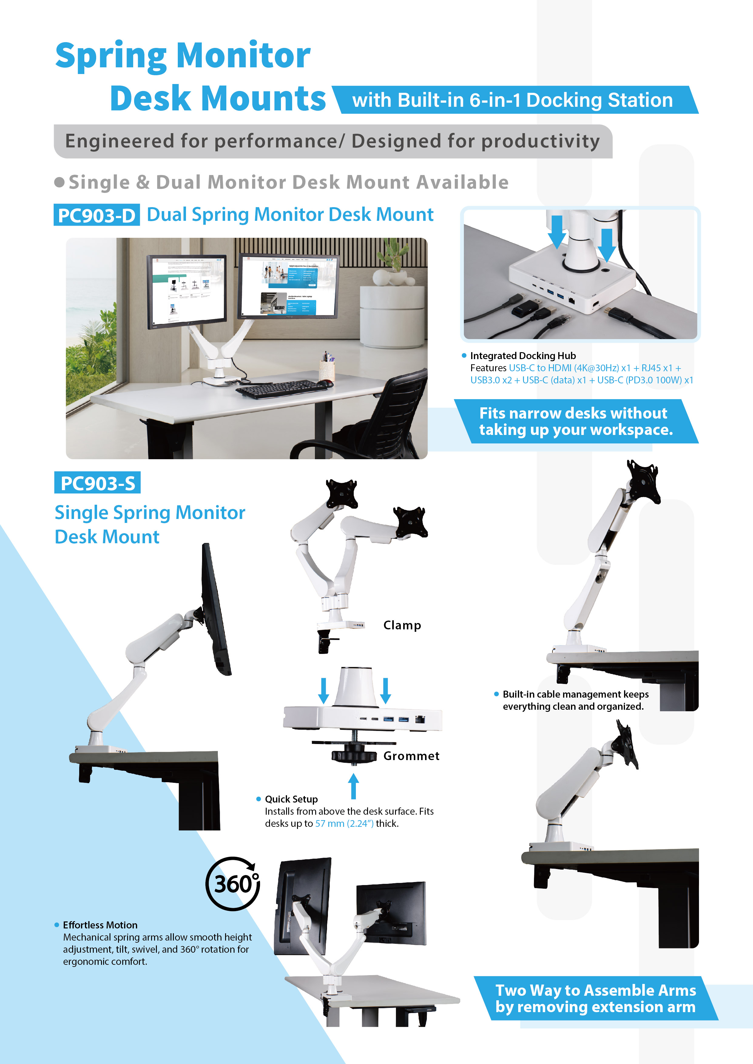 - Dual Spring Monitor Desk Mount with Build-in 6-in-1 Docking Station